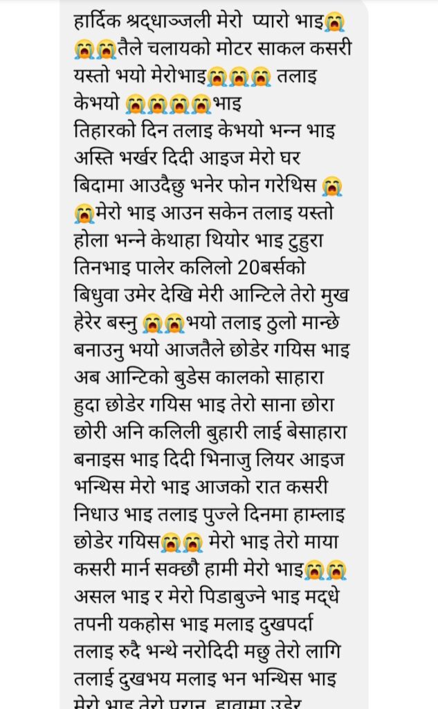 मृत्यु हुनेमा आलिताल गाउँ पालिका-३ चनला(हाल गोदावरी नगरपालिका-२ तेघरीका ३३ वर्षीय शेरबहादुर पुनमगर भएको जिल्ला प्रहरी कार्यालय कैलालीले जनाएको छ।शेर बहादुरको मृत्यु पछि उनको गाउँ शोकमा डुबेको छ । मगरको श्रीमती संगै एक छोरा र दुई छोरी पनि छन ।अल्पायु मै मृत्यु भए पछि परिवारको बिचल्ली जस्तै भएको छ । दुर्घटना पछि उनलाई उपचारका लागि सेती प्रादेशिक अस्पताल धनगढी लगिएको थियो । कार चालक ३३ वर्षीय युसुभ श्रेष्ठलाई प्रहरीले नियन्त्रणमा लिएइको बताएको छ।पारिवारिक बेदना :