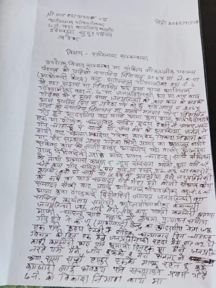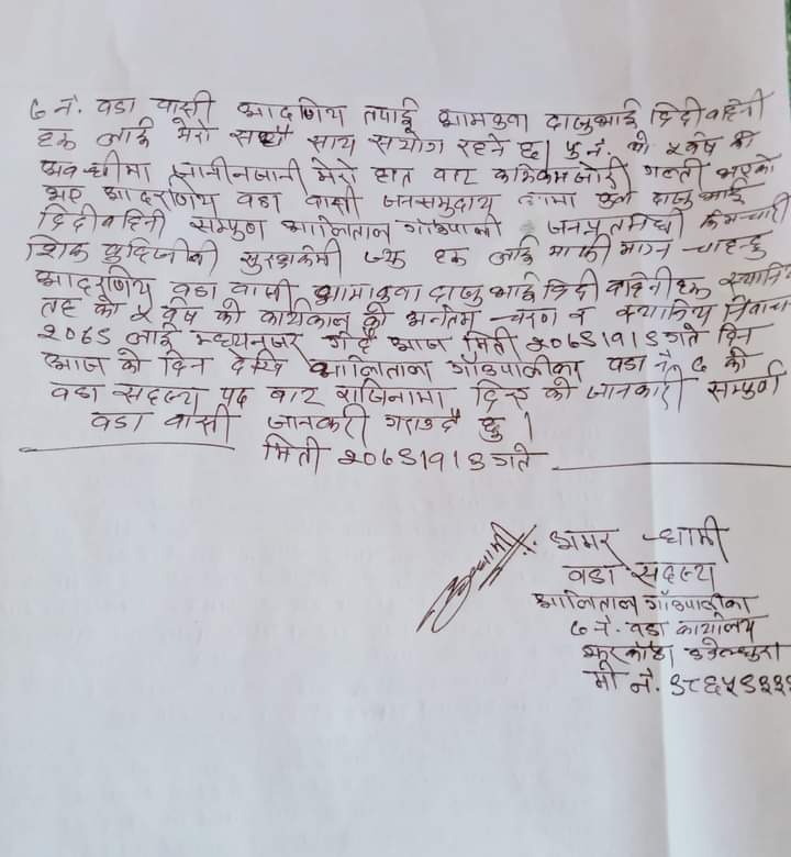 आलिताल ७ वडा सदस्य धामीले दिए राजिनामा(विज्ञप्ति सहित)