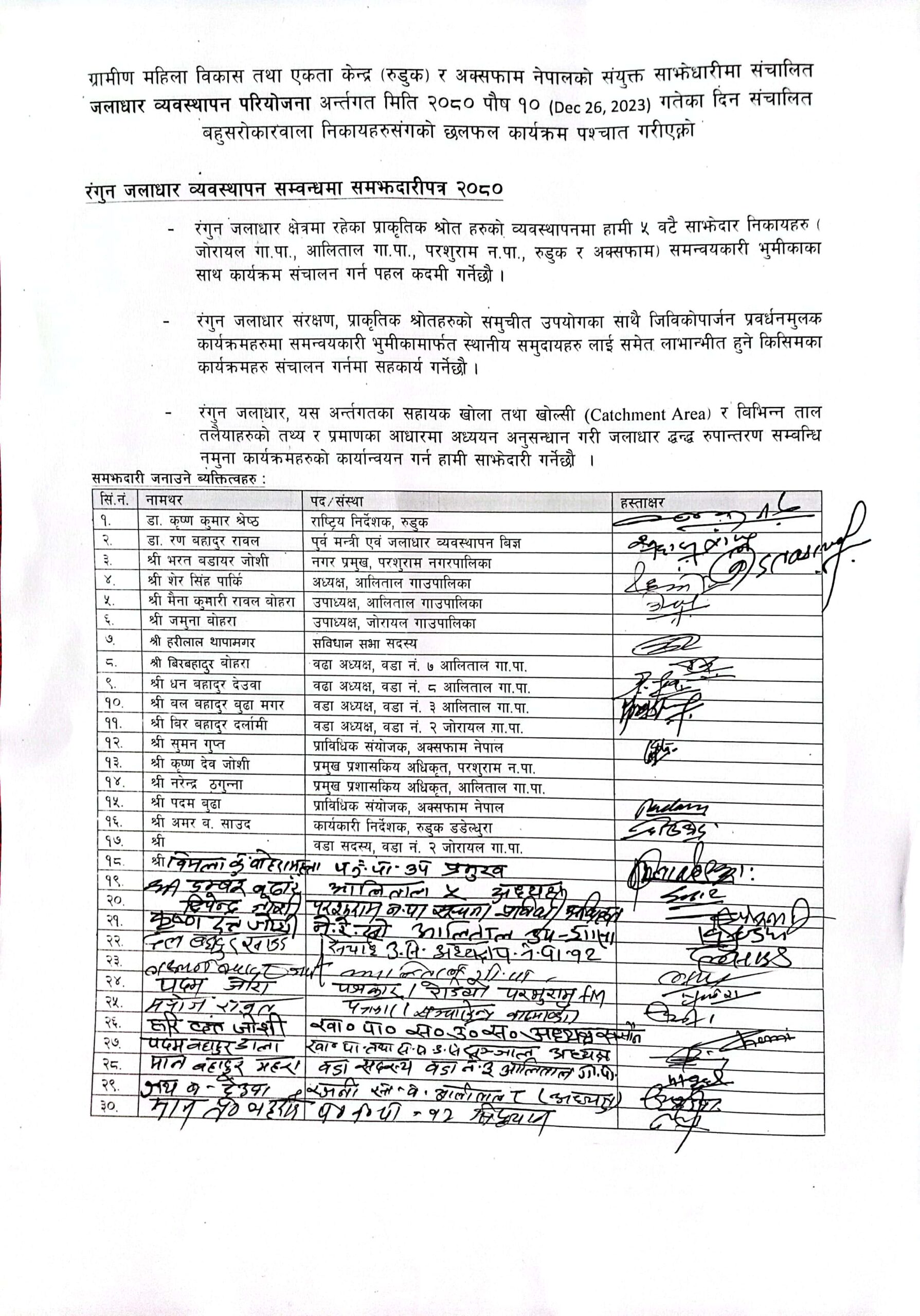 रूडुकका केन्द्रिय निर्देशक डा.कृष्ण कुमार श्रेष्ठ र जलाधार ब्यबस्थापन विज्ञ डा. रण बहादुर रावल परशुराम नगरपालिका प्रमुख भरत जोशी ,आलिताल गाउँपालिका अध्यक्ष शेर सिंह पार्की , परशुराम नगर पालिका उपप्रमुख बिमला महता,जोरायल गाउँ पालिका उपाध्यक्ष जमुना बोहरा ,आलिताल गाउँ पालिका उपाध्यक्ष मैना कुमारी रावल लगाएको उपस्तिथि रहेको कार्यक्रममा रङुन जलाधार ब्यबस्थापन सम्बन्धी समझदारी पत्रमा हस्ताक्षर समेत गरिएको छ ।
