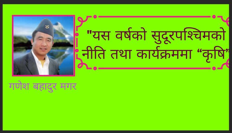 सुदूरपश्चिम प्रदेश सरकारका माननिय प्रदेश प्रमुख देव राज जोशीबाट मिति २०८० जेष्ठ २४ गतेका दिन सुदूरपश्चिम प्रदेश सभामा प्रस्तुत गर्नुभएको आर्थिक वर्ष ०८०/०८१ को नीति तथा कार्यक्रम हेर्ने हो भने सुदूरपश्चिम प्रदेशले कृषिमा कायापलट नै गर्ने हो की भन्ने भान हुन्छ ।
