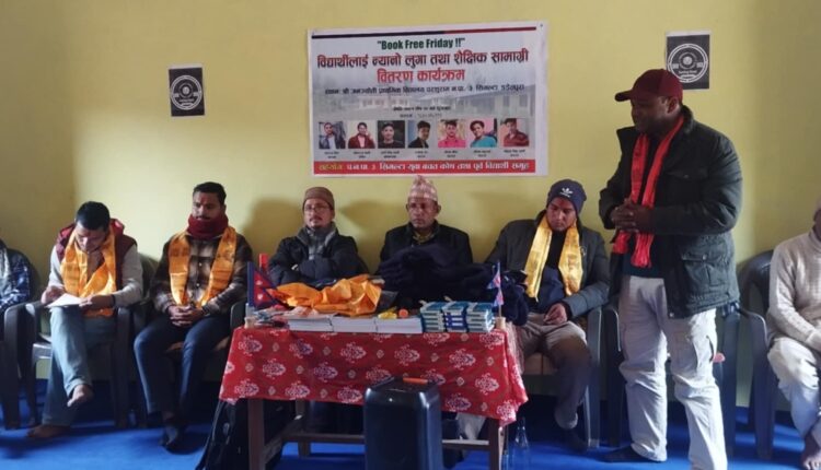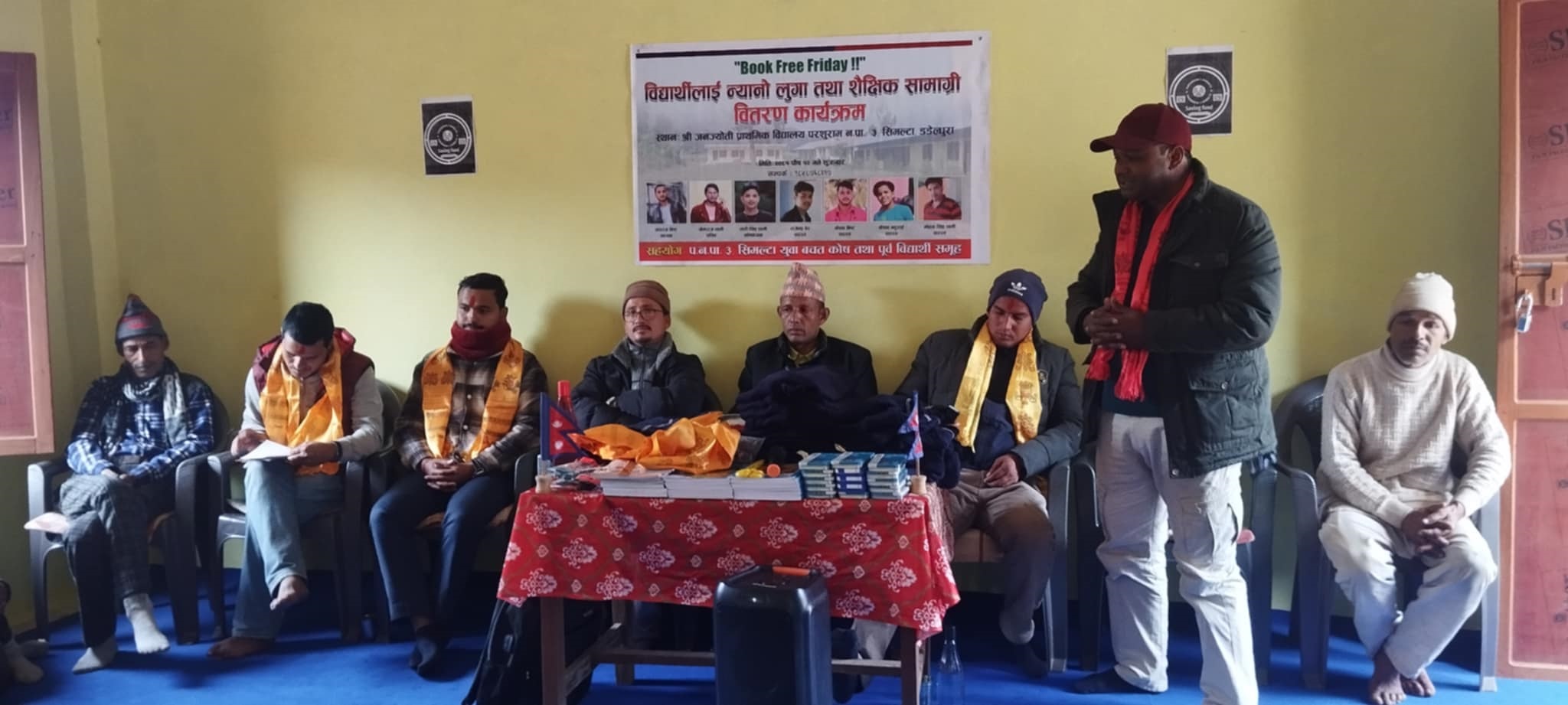 आज भएको बुक फ्रि फ्राइ डे कार्यक्रम अन्तर्गत बिद्यार्थीलाई शैशिक सामाग्री तथा न्यानो कपडा बितरण गरेको हाे ।