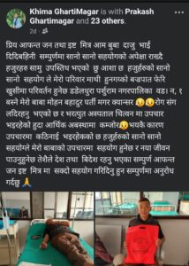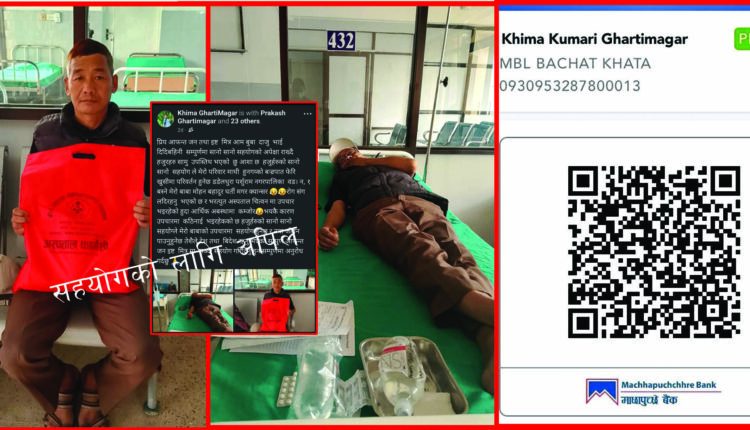 मोहन बहादुरकी छोरी खिमा घर्ती मगरले भावुक अपिल गर्दै सामाजिक सञ्जालमा लेखेकी छन् – “मेरो बाबुलाई मुखमा क्यान्सर भएको छ। उहाँको उपचारका लागि धेरै खर्च लाग्दैछ, तर हाम्रो परिवारको आर्थिक अवस्था कमजोर छ। हजुरहरूको सानो सहयोगले उहाँको उपचारमा ठूलो मद्दत पुग्नेछ र नयाँ जीवन पाउनु हुनेछ।”