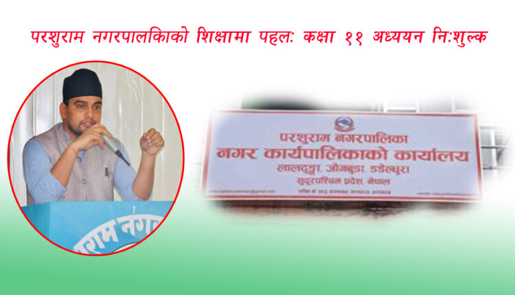 आज नगरप्रमुख भरत जोशीले सामाजिक सञ्जालमार्फत भिडियो सन्देश जारी गर्दै भने, “परशुराम नगरपालिका भित्र कक्षा ११ मा अध्ययनरत सबै विद्यार्थीहरूलाई निःशुल्क पढ्ने प्रबन्ध गरिएको छ। अब कक्षा ११ को शुल्क नगरपालिकाले तिर्नेछ।”
