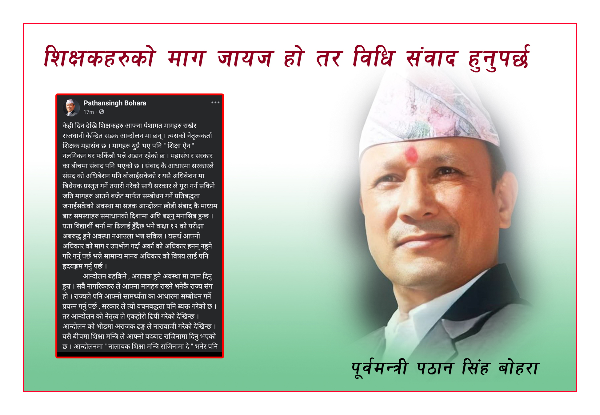 पूर्वमन्त्री बोहराद्वारा शिक्षक आन्दोलनलाई संवादबाट समाधान गर्न सुझाव