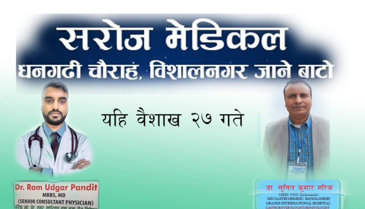 धनगढी चौराहास्थित विशालनगर जाने सडकमा रहेको सरोज मेडिकलले विगत केही वर्षदेखि स्थानीयस्तरमा गुणस्तरीय स्वास्थ्य सेवा प्रदान गर्दै आएको छ। यस शिविरको अवसर बिरामीहरूले नछुटाउन सञ्चालक पाण्डेयले अनुरोध गरेका छन्।