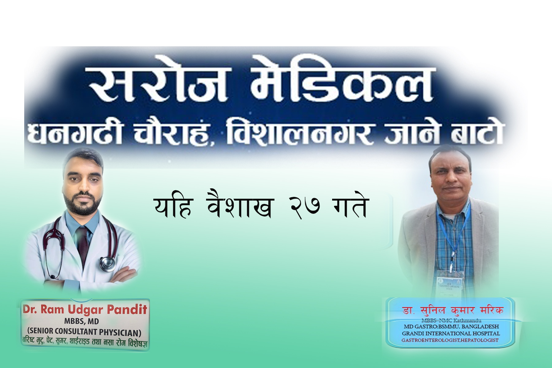 धनगढी, बैशाख २४ – धनगढी चौराहास्थित सरोज मेडिकलमा पुनः एकपटक पाचन रोग विशेषज्ञ सेवा उपलब्ध हुने भएको छ। ग्राण्डी इन्टरनेशनल हस्पिटल, काठमाडौंका पाचन रोग विशेषज्ञ डा. सुनिल कुमार मरिक यही बैशाख २७ गते पुनः सरोज मेडिकलमा सेवा दिन आउने भएका छन्।